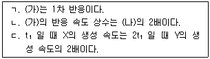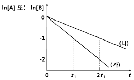 그림은 반응 (가) A → X와 반응 (나) B → 2 Y의 반응 시간 에 따른 ln [A] 또는 ln [B]를 나타낸 것이다.