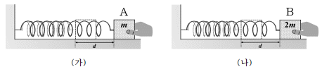 그림 (가)와 (나)는 수평면에서 한쪽 끝이 고정된 두 개의 용수철에 각각 질량이 m, 2m인 물체 A, B를 평형 위치에서 같은 길이 d 만큼 늘어난 곳에서 잡고 있는 모습을 나타낸 것이다. 두 용수철의 용수철 상수는 같고, 물체를 가만히 놓았을 때 A와 B는 단진동을 한다.