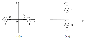 그림 (가)는 마찰이 없는 xy평면에서 질량이 각각 m, 2m 인 물체 A, B가 x축을 따라 서로 반대 방향으로 등속 운동하는 것을 나타낸 것이다. A, B의 속력은 각각 v, v/2 이다. t=0 일 때 A와 B는 원점에서 탄성 충돌한 후, 그림 (나)와 같이 y축을 따라 등속 직선 운동한다.