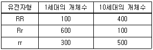 표는 발생이 정상적으 로 이루어지는 어느 생물 집단 의 1세대와 1 0세대에서 유전자형에 따른 개체 수를 나타낸 것이다.