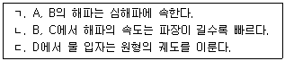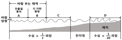 그림은 바람이 부는 해역에서 풍파가 발생하여 해안으로 진행하는 과정을 나타낸 모식도이다.