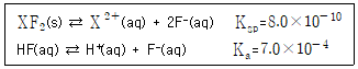 다음은 T℃에서 XF2(s)와 HF(aq)에 대한 수용액에서의 평형 반응식과 용해도곱 상수(Ksp) 및 산 해리 상수(Ka)이다.