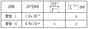 표는 T℃에서 XF2(s)를 순수한 물과 산성 완충 용액에서 녹여 도달한 평형 Ⅰ과 Ⅱ에 대한 자료이다.