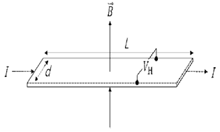 그림은 길이가 L이고 선폭이 d인 직사각형 모양의 두께가 일정한 도체 띠에 직류 전류 I 가 흐르고 있는 것을 나타낸 것이다. 도체 띠 평면에 수직으로 크기가 B인 균일한 자기장을 걸었을 때 선폭 양단 사이의 홀(Hall) 전압은 VH 이다. 다른 조건은 동일하고 선폭이 2d인 도체 띠에 직류 전류 I가 흐르고, 크기가 4B인 균일한 자기장을 걸었을 때 선폭 양단 사이의 홀(Hall) 전압은?