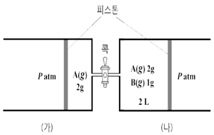 는? (단, 외부 압력은 P atm 으로 일정하다. 피스톤의 마찰과 연결관의 부피는 무시하며, 모든 기체는 이상 기체로 거동한다.)