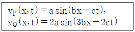 다음은 팽팽한 두 줄에 생긴 가로 파동 P, Q의 높이 변화 yP, yQ를 위치 x와 시간 t의 함수로 각각 나타낸 것이다.