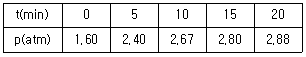 표는 20L의 용기에 A(g)를 넣고 온도 T에서 반응시켰을 때 반응 시간(t)에 따른 용기 속 기체의 압력(p)을 나타낸 것이다.