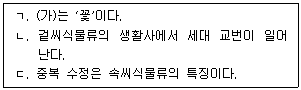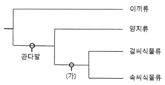 그림은 파생 형질을 포함하는 식물 계통수의 일부를 나타낸 것이다. (가)는 '꽃'과 '종자' 중 하나이다.