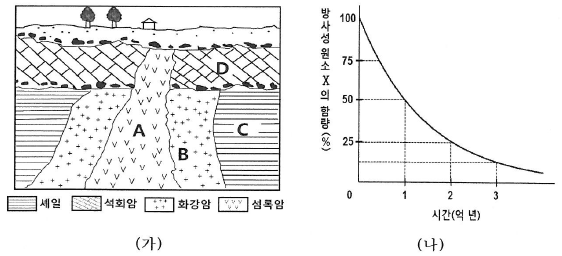 그림 (가)는 어느 지역의 지질 단면도를 (나)는 방사성 원소 X의 붕괴 곡선을 나타낸 것이다. A와 B에 들어 있는 방사성 원소 X의 양은 붕괴 후 각각 처음 함량의 50%, 25% 이다.