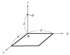 그림과 같이 xy 평면의 일사분면에 놓인 한 변의 길이가 d인 정사각형의 한 꼭짓점은 원점에 있고, 점전하 +q는 원점에서 d만큼 떨어져 z축 상에 고정되어 있다.