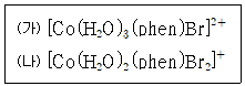 다음은 H2O, Br-, 두 자리 리간드 phen이 배위 결합한 정팔면체 C o(III) 착이온 (가)와 (나)의 화학식이다. phen은