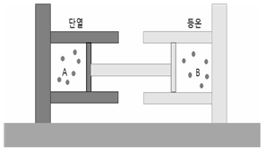 그림은 힘의 평형을 이루며 정지해 있는 연결된 피스톤과 단원자 이상기체 A와 B가 각각 실린더에 들어 있는 모습을 나타낸 것이다. A와 B의 압력, 부피, 절대온도는 각각 P, V, T 로 같다. A가 들어 있는 실린더는 단열되어 있고, B가 들어있는 실린더는 외부와 열적 평형을 이룬다. 이때 A에 열량 Qin(>0)을 서서히 공급하면, A의 나중 온도는 4T가 되고 B에서 열량 Qout(>0)이 외부로 방출된다.
