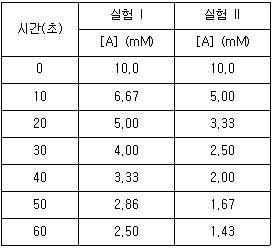 다음은 A와 B가 반응하여 C와 D를 생성하는 화학 반응식이다. [2A + B → C + D]. 표는 반응 차수가 1차인 반응물 B의 서로 다른 초기 농도([B]0)에서 반응 시간(초)에 따른 반응물 A의 농도 변화를 나타낸 실험 I과 II의 자료이다. 실험 I에서 [B]0 = 10.0M이고, 실험 II에서는 [B]0 = 20.0M이다. 반응이 진행되는 동안 B의 농도는 일정하다고 가정한다.
