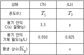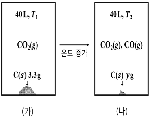 그림 (가)는 온도 T1에서 부피가 40L로 일정한 진공용기에 탄소 가루(C(s))와 CO2(g)를 넣은 반응 초기 상태를, (나)는 온도를 T2 로 올려 반응이 진행된 후 평형에 도달한 상태를 나타낸다. 표는 (가)와 (나)에서의 자료이다.