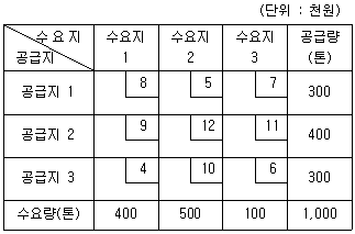 다음 수송표의 수송문제에서 북서코너법을 적용할 때, 총 운송비용과 공급지 2에서 수요지 2까지의 운송량은? (단, 공급지에서 수요지까지의 톤당 운송비는 각 칸의 우측 상단에 제시되어 있음)