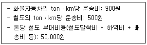화물자동차운송과 철도운송 조건이 다음과 같을 때 채트반공식을 이용한 자동차의 한계 경제효용거리(km)는?