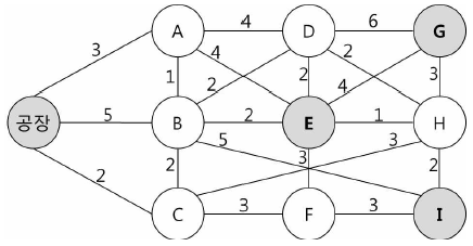 운송회사는 공장에서 물류창고 E, G, I까지 각각 1대씩의 화물차량을 배정하려고 한다. 최단거리로 운송할 경우에 합산한 총운송거리는? (단, 링크의 숫자는 거리이며 단위는 km임)