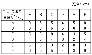 산업단지 내에 있는 6개의 물류거점을 모두 연결하는 도로를 신설하려고 한다. 총도로연장을 최소화할 경우에 필요한 도로연장은? (단, 다음은 각 링크의 출발지 물류거점, 도착지 물류거점, 해당 링크연장을 나타내고 ‘0’은 해당 링크가 없음을 나타냄)