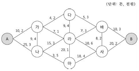 A 공장에서 B 물류창고까지 도로망을 이용하여 상품을 운송하려고 한다. 최소 비용수송계획법에 의한 A 공장에서 B 물류창고까지의 총운송비용 및 총운송량은? (단, 링크의 첫째 숫자는 도로용량, 둘째 숫자는 톤당 단위운송비용임)