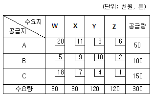 운송회사는 공급지 A, B, C에서 수요지 W, X, Y, Z까지 화물을 운송하려고 한다. 최소비용법에 의한 총운송비용과 공급지 B에서 수요지 X까지의 운송량은? (단, 공급지와 수요지간 톤당 단위운송비용은 셀의 우측 상단에 표시됨)