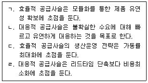 효율적(Efficient) 공급사슬 및 대응적(Responsive) 공급사슬에 관한 설명으로 옳은 것을 모두 고른 것은?