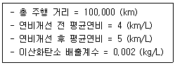 A기업은 최근 수송부문의 연비개선을 통해 이산화탄소 배출량(kg)을 감소시켰다. 총 주행 거리는 같다고 가정할 때, 연비개선 전 대비 연비개선 후 이산화탄소 배출감소량(kg)은? (단, 이산화탄소 배출량(kg) = 연료사용량(L) × 이산화탄소 배출계수(kg/L))
