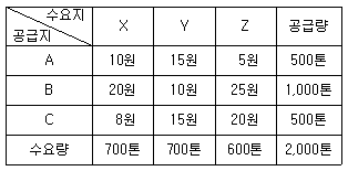 3개의 수요지와 공급지가 있는 운송문제에서 최소비용법(Least-cost Method)을 적용하여 산출한 최초 가능해의 총운송비용은? (단, 공급지와 수요지 간 비용은 톤당 단위운송비용임)