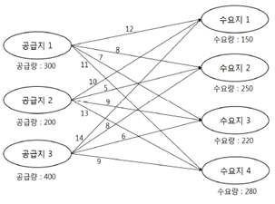 3개의 공급지와 4개의 수요지에 대한 수송모형에서 공급지에서 수요지 간의 1단위 수송비용이 다음과 같을 때 총 운송비용의 최소값을 구하기 위한 제약조건식으로 옳은 것은? (단, Xij에서 X는 물량, i는 공급지, j는 수요지를 나타냄)