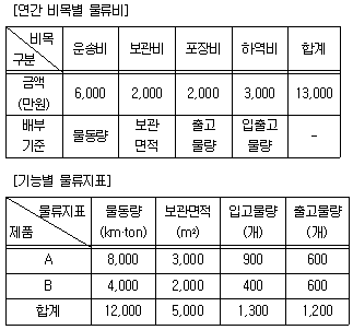 다음 표는 제품 A와 제품 B를 취급하는 물류업체의 연간 비목별 물류비와 기능별 물류지표에 관한 자료이다. 이에 관한 설명으로 옳은 것은? (단, 자료에서 제시한 것 외의 사항은 고려하지 않는다.)