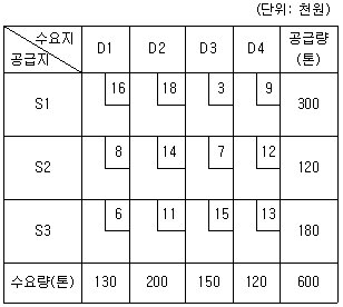 다음 수송표에서 최소비용법과 보겔추정법을 적용하여 총 운송비용을 구할 때 각각의 방식에 따라 산출된 총 운송비용의 차이는? (단, 공급지에서 수요지까지의 톤당 운송비는 각 셀의 우측상단에 표시되어 있음)