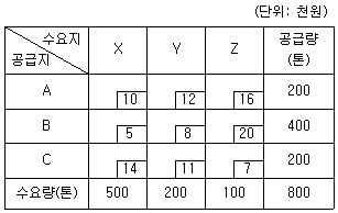 수요지와 공급지 사이의 수송표가 아래와 같을 때 보겔추정법(Vogel's Approximation Method)을 적용하여 산출된 총 운송비용과 공급지 B에서 수요지 X까지의 운송량은? (단, 공급지에서 수요지까지의 톤당 운송비는 각 셀의 우측하단에 표시되어 있음)