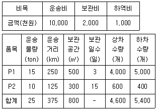 K 물류센터의 6월 비목별 간접물류비와 품목별 배부를 위한 자료가 다음과 같다. 간접물류비 배부기준이 운송비는 (운송물량 × 운송거리), 보관비는 (보관공간 × 보관일수), 하역비는 (상차수량 + 하차수량)일 때, 품목별 간접물류비 배부액(단위: 천원)은?