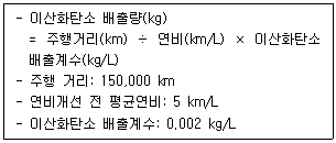 A기업은 수송부문 연비 개선을 통해 이산화탄소 배출량을 10 kg 줄이고자 한다. 연비법에 의한 이산화탄소 배출량 산출식 및 관련 자료는 다음과 같을 때, 이산화탄소 배출량 10 kg 감축을 위한 A기업의 목표 평균 연비는?