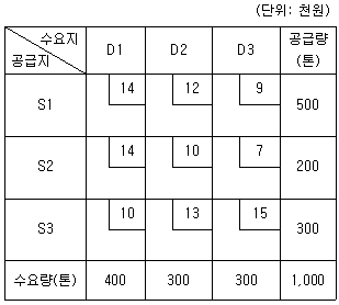 다음 수송표에서 최소비용법을 적용한 총 운송비용에 관한 내용으로 옳은 것은? (단, 공급지에서 수요지까지의 톤당 운송비는 각 칸의 우측 상단에 제시되어 있음)