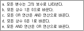 드모르간(De Morgan' theorem) 정리는 임의의 논리식 보수를 구하는 순서가 있다. [보기]에서 보수를 구하는 일반적인 순서로 옳은 것은?