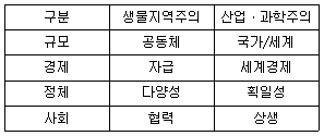 다음의 생물지역주의와 산업ㆍ과학주의 패러다임 비교에서 그 연결이 맞지 않는 것은?