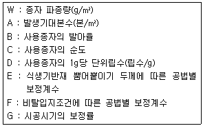 식물군락을 녹화용 식물의 종자 파종으로 조성하고자 할 때 파종량을 구하는 식으로 옳은 것은? (단, [보기]의 항목을 이용하여 식을 구하시오.)