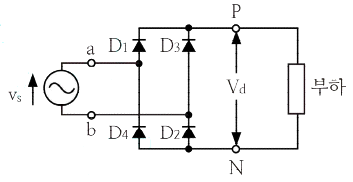 그림의 회로에서 입력 전원(vs)의 양(+)의 반주기 동안에 도통하는 다이오드는?