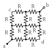 그림과 같은 전기회로에서 단자 a-b에서 본 합성저항은 몇 Ω 인가? (단, 저항 R은 3Ω 이다.)