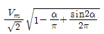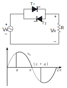 단상 교류 위상제어 회로의 입력 전원전압 이 vs=Vmsinθ이고, 전원 vs 양의 반주기 동안 사이리스터 T1을 점호각 α에서 턴온 시키고, 전원의 음의 반주기 동안에는 사이리스터 T2를 턴온 시킴으로써 출력전압(v0)의 파형을 얻었다면 단상 교류 위상제어 회로의 출력전압에 대한 실효값은?