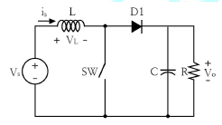 그림의 부스터 컨버터 회로에서 입력전압 (Vs)의 크기가 20V이고 스위칭 주기(T)에 대한 스위치(SW)의 온(On) 시간(ton)의 비인 듀티비(D)가 0.6이었다면, 부하저항(R)의 크기가 10Ω인 경우 부하저항에서 소비되는 전력(W)은?