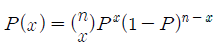 이항분포(binomal distribution)에서 매회 A가 일어나는 확률이 일정한 값 P일 때, n회의 독립시행 중 사상 A가 x회 일어날 확률 P(x)를 구하는 식은? (단, N은 로트의 크기, n은 시료의 크기, P는 로트의 모부적합품률이다.)