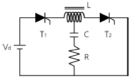 그림과 같은 직렬형 인버터에 대해서 L=1mH, C=8㎌일 때 출력 주파수를 1kHz로 할 경우 거의 정현파의 출력전압 파형이 얻어진다. 이 때 부하 저항 R은 몇 Ω인가?