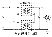 2개의 단상 변압기(220/6000V)를 그림과 같이 연결하여 최대 사용전압 6600V의 고압전동기의 권선과 대지사이의 절연내력시험을 하는 경우 입력전압(V)과 시험전압(E)은 각각 얼마로 하면 되는가?