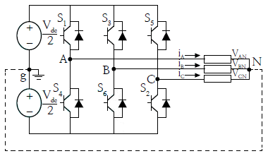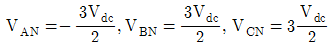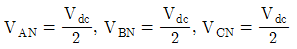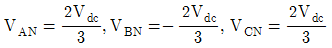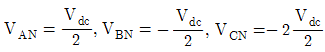 아래 그림의 3상 인버터 회로에서 온(On)되어 있는 스위치들이 S1, S6, S2오프(Off)되어 있는 스위치들이 S3, S5, S4라면 전원의 중성점 g와 부하의 중성점 N이 연결되어 있는 경우 부하의 각 상에 공급되는 전압은?