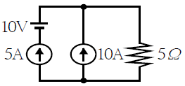 그림의 회로에서 5Ω의 저항에 흐르는 전류 (A)는? (단, 각각의 전원은 이상적인 것으로 본다.)