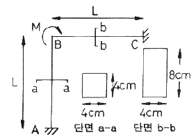 다음과 같은 구조물의 B점에 M의 모멘트가 작용할 때 분배모멘트 MBA와 MBC의 비는?