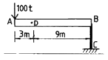 그림과 같이 강체인 AB부재가 D점을 중심으로 회전이 가능할 때 A단에 100t의 하중이 작용한다. 이 때 BC 강선에 작용하는 응력의 크기는? (단, BC 강선의 단면적은 6cm2 이다.)