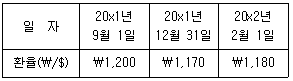 (주)감평은 20x1년 9월 1일 미국에 있는 토지(유형자산)를 $5,000에 취득하고 원가모형을 적용하고 있다. 20x1년 12월 31일 현재 토지의 공정가치는 $5,100이며, 20x2년 2월 1일 토지 중 30%를 $1,550에 처분하였다. 일자별 환율이 다음과 같을 때, 처분손익은? (단, (주)감평의 기능통화는 원화이다.)