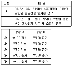 (주)감평은 20x1년 10월 1일에 고객과 원가 \900의 제품을 \1,200에 판매하는 계약을 체결하고 즉시 현금판매 하였다. 계약에 따르면 (주)감평은 20x2년 3월 31일에 동 제품을 \1,300에 재매입할 수 있 는 콜옵션을 보유하고 있다. 동 거래가 다음의 각 상황에서 (주)감평의 20x2년도 당기순이익에 미치는 영향은? (단, 각 상황(A, B은 독립적이고, 화폐의 시간가치는 고려하지 않으며, 이자비용(수익)은 월할계산한다.)